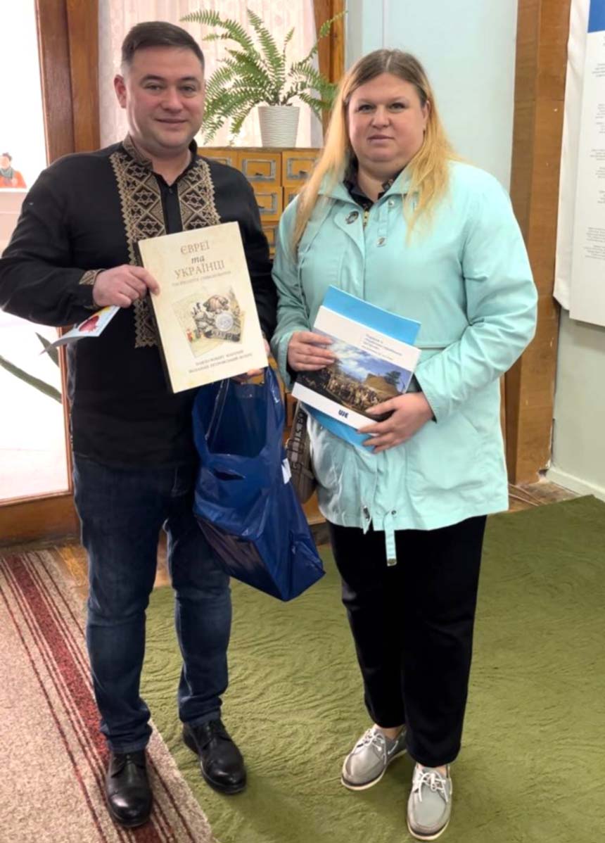 Vladyslav Hrynevych, Jr., UJE's regional manager in Ukraine, presents Olena Chervinska, head of Kaniv's Jewish community, with a set of books published with UJE support. Kaniv, 31 October 2025.