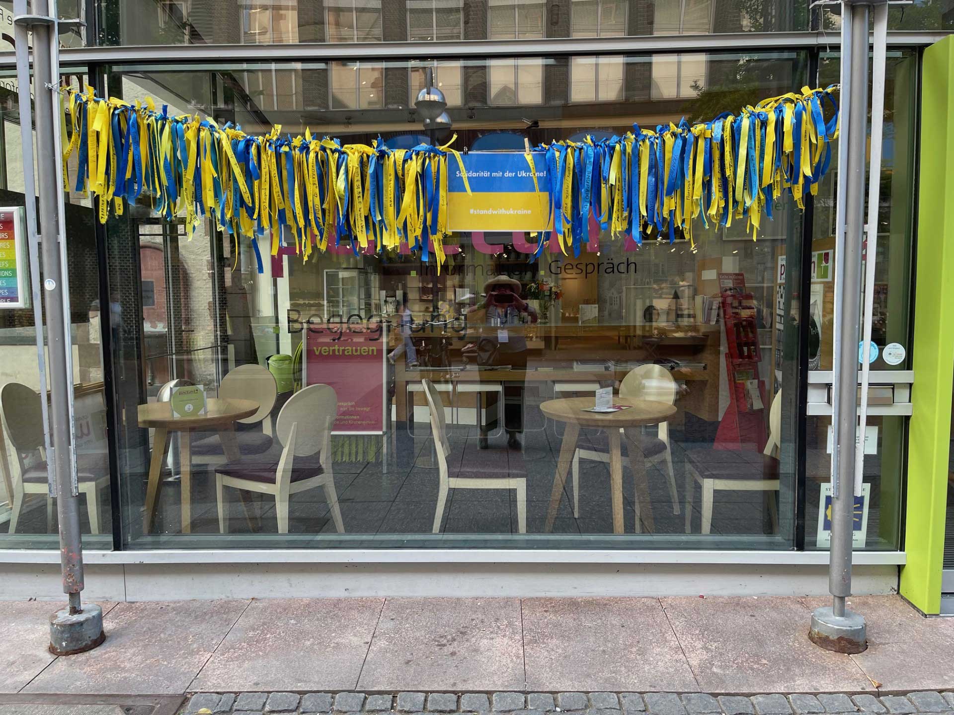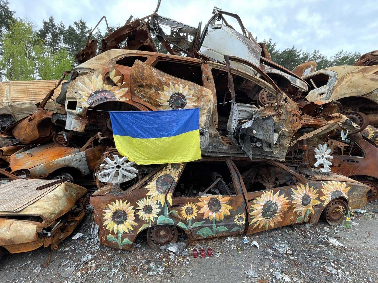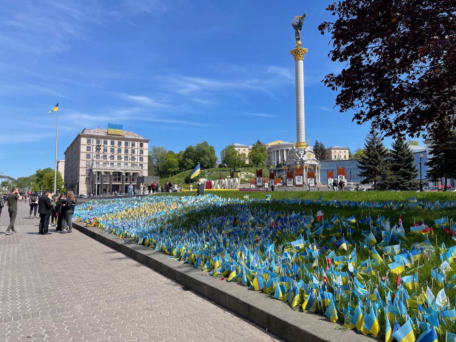 Mykhailivska Square in Kyiv on 28 April 2023.Cars destroyed during intense fighting in 2022 are part of a makeshift memorial outside Irpin, a city near Kyiv, on 30 April 2023.Israel's "Ethnokhutir" Ukrainian festival held in Tel Aviv on 23 June 2023 provided an opportunity to protest Russia's full-scale invasion of Ukraine and to show solidarity between Ukrainians and Jews. The fair, organized by the non-profit Israeli Friends of Ukraine, is held annually to celebrate Ukrainian food and culture. The organization has been instrumental in raising awareness of Ukraine in Israel.Each Ukrainian flag in this photo, taken on 2 May 2023 in Kyiv's central square, the Maidan, represents the life of a fallen soldier. The Maidan has become a citizens' memorial to those killed in Russia's genocidal war against Ukraine.A sign on Kyiv's main boulevard Khreshchatyk on 2 May 2023 reads "Veterans are various, the victory is one. With respect to everyone who makes Ukraine stronger." The soldier is a Crimean Tatar who is holding the flag of Crimea, an autonomous region of Ukraine. Russia illegally invaded and annexed the peninsula in 2014.Seen in Frankfurt on 18 July 2023. Germans stand in solidarity with Ukraine. As of early February 2026, Germany has provided temporary protected status to approximately 1.25 million Ukrainian refugees, mostly women and children.A Ukrainian soldier visits an exhibition honoring famed Ukrainian artist, Maria Primachenko on 17 September 2023 at Kyiv's Ukraine House. A self-taught artist in the Native art movement, Primachenko was awarded the Shevchenko National Prize, Ukraine's highest state prize for cultural achievements, in 1966. Over 20 of her works that were held in a museum outside Kyiv were destroyed during Russia's full-scale 2022 invasion. Fragments of her works are now reproduced in popular lapel pins.A Ukrainian trident in Kyiv on 22 September 2023 stands atop a pedestal that once held a Lenin memorial. The removal of this Soviet figure marks a nationwide movement to remove Soviet and Russian memorials from the country.Despite challenges, Ukrainian publishers continue to participate in international book festivals with relevant themes such as "Fragility of Existence", as seen on 20 October 2023 at the Frankfurt Book Fair. Ukrainian writers are increasingly recognized internationally, with their works translated into major languages.