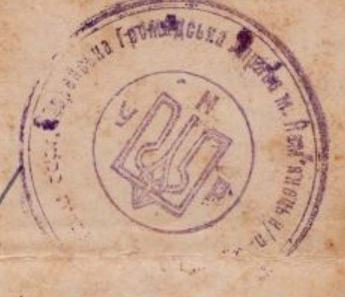 Second, in the center of the Jewish community's stamp is a trident with the inscription "UNR" and a Ukrainian/Hebrew parallel text.