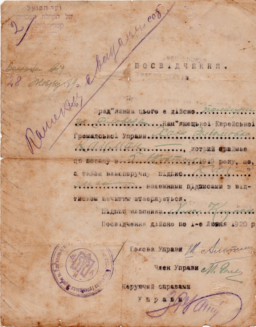 However, I was able to purchase one such document in June 2020 at an auction in Israel. It is a document attesting that one Khana Shliomovna Katsman is the assistant clerk of the Jewish Public Administration of the city of Kamianets-Podilsky.