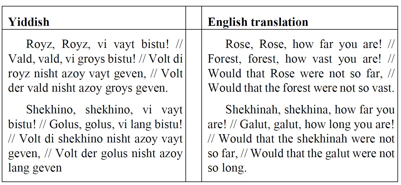 Songs based on a combination of the Ukrainian and loshn-koydesh are also found in the thematic category of lamentations over the fate of Jews in the Diaspora and a plea to the forefathers to lead them out of exile. Here is an example: [20]