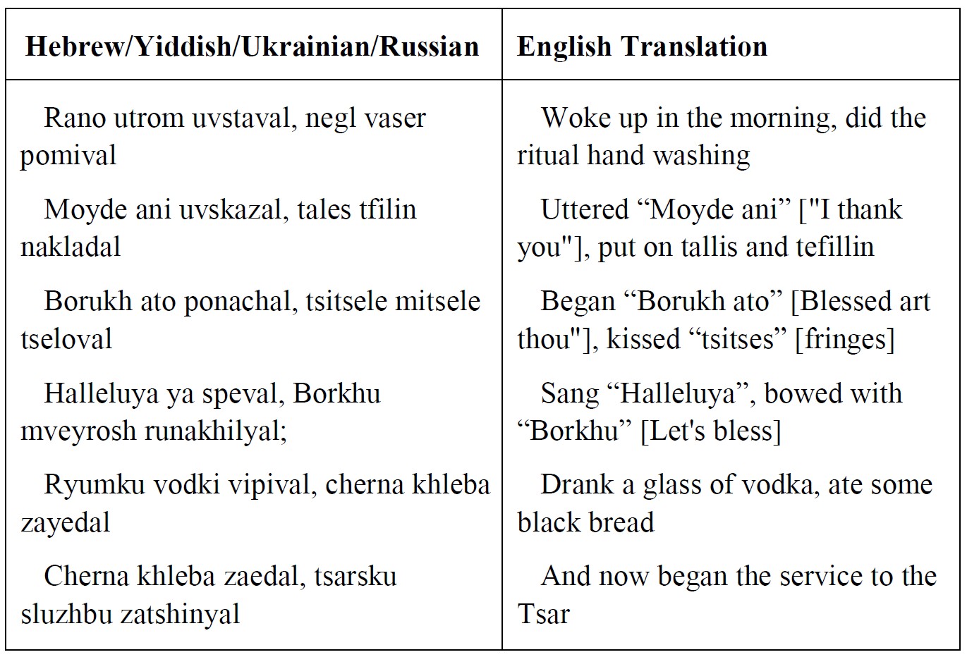 In religious and national songs, the life of a faithful Jew is often interpreted in terms of strictly regulated service to God. The texts of many of these songs combine loshn-koydesh (holy language, the Ashkenazi version of Biblical-Talmudic Hebrew) and a blend of elements of several Slavic languages. Slavic vocabulary (Ukrainian, Russian) usually dominates, but it is altered to become a blend of elements, while the main elements of the religious terminology remain unchanged in the original language. The following example is typical: [19]