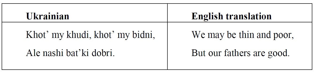 Hasidim adapted numerous Ukrainian song lyrics to their own Hasidic melodies that would be performed during weekly Sabbath gatherings. Reinforced with the powerful expressiveness of collective singing, those original Ukrainian texts would acquire additional mystical connotations, beyond the literal meaning of the words. The song "Khot' my khudi" ["Though we are thin"] alludes to the three Patriarchs, the physical and spiritual ancestors of Judaism — Abraham, Isaac, and Jacob: [21]
