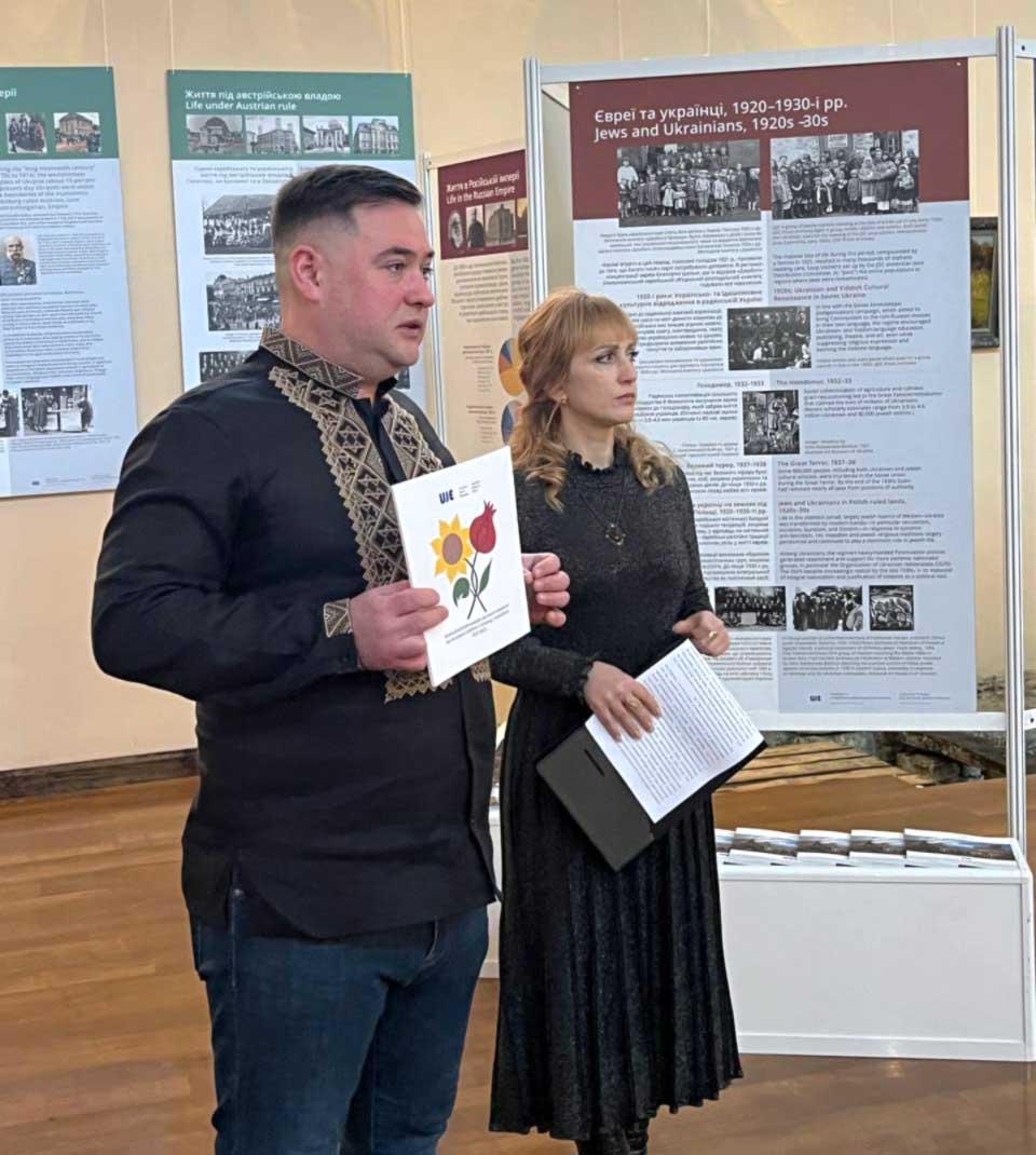 The first to take the floor was Vladyslav Hrynevych, Jr., UJE's regional manager in Ukraine, who presented the organization's main areas of activity, outlined its mission in intercultural diplomacy, and discussed the exhibition's structure and content. He emphasized that the exhibition seeks to present a holistic, multifaceted history of Ukrainian-Jewish relations, not focusing solely on periods of crisis, but also demonstrating centuries-old coexistence, joint work, cultural development, and dialogue.