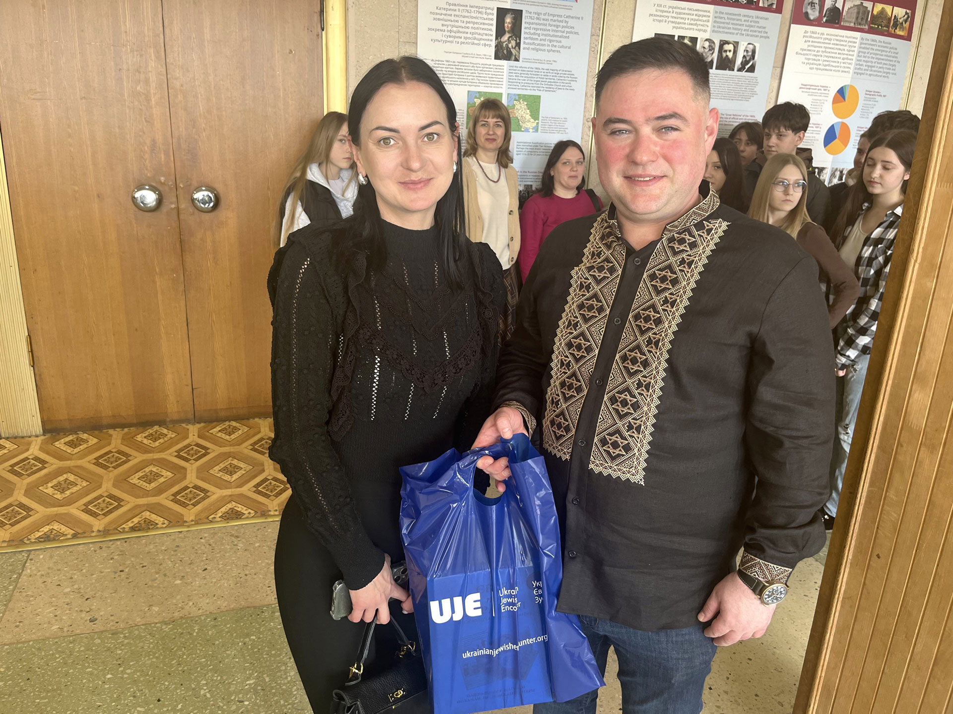 Vladyslav Hrynevych, Jr., UJE's regional manager in Ukraine, outlined the organization's activities and educational and research initiatives aimed at deepening the dialogue between Ukrainians and Jews. He presented a selection of books published with UJE's support to the local educational and public institutions. The books were received by Inna Shypilova, Head of the Education Department of the Vasylkiv Town Council, Maria Kulivnyk, and Viacheslav Zipman, head of the Jewish community in Vasylkiv.