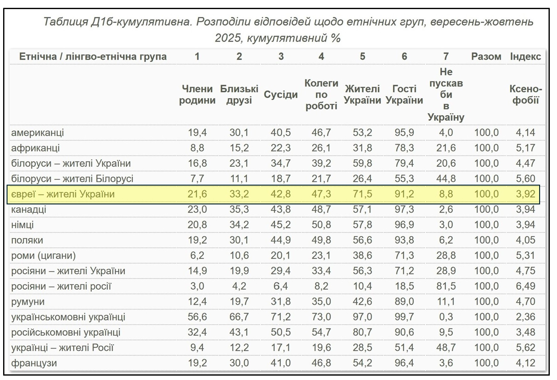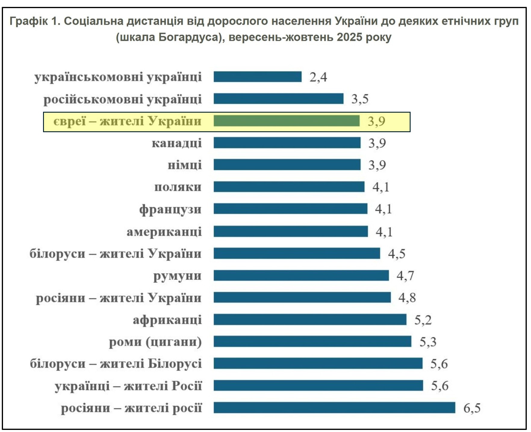 - євреї — жителі України: дистанція 3.9 у 2025 році (збільшення дистанції на 0.1 порівняно з 2022 роком);