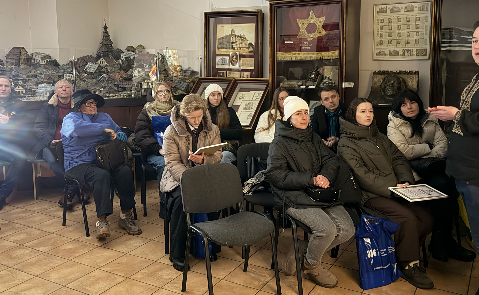 Всеукраїнський конкурс учнівського малюнкаПід час урочистої церемонії нагородження переможців Всеукраїнського конкурсу учнівського малюнка «Українсько-Єврейська Зустріч: наші історії неповні одна без одної — 2025». Зліва направо: Ірина Климова, директорка Музею Шолом-Алейхема та голова фахового міжнародного журі Конкурсу; Ольга Пухкало, місто Суми; Олександра Радько, місто Зіньків, Полтавська область; Світлана Гриневич, адміністраторка Українського представництва UJE та кураторка Конкурсу; Варвара Медончак, фіналістка та переможниця Конкурсу (у 2023 та 2024 роках); Владислав Гриневич, Регіональний менеджер UJE в Україні; Діана Кучерчук, село Черняхів, Житомирська область; Олександра Ковтунович, місто Житомир; Анастасія Клопотовська, місто Житомир; Наталія Федущак, директорка з комунікацій UJE. Музей Шолом-Алейхема, 7 лютого 2026 року, місто Київ.